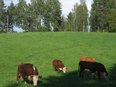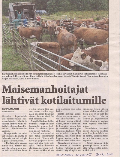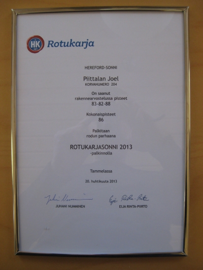 Suoraan tilaltamme myytävien, keväällä 2011 syntyneiden sonnien tiedot ovat päivittyneet "Myytävät eläimet" välilehdelle. Käy katsomassa.. Niin on Joulut juhlittu ja Uusi Vuosikin saatu mukavasti käyntiin. Ja ennenkaikkea pakkaset ja lumi ovat vihdoin saapuneet Orivedelle. Emotilan rauhallinen talvisesonki on parhaimmillaan. Kohta jo vuoden ikään ehtineet lehmä-ja sonnivaskikat kasvavat pihatossa ja emot nauttivat talvisista ulkoilukeleistä. Muutama koulutus-ja messupäivä on vielä edessä talonväelle ennen kevättä ja sitten voikin uusi poikimakausi alkaa. Sitä odotellessa... Tapatumia vuodelta 2011 Punnitukset vasikoille (200pv) saatiin hoidetuksi. Ali-Lekkalan jalostuskasvattamoon tuli valituksi 8 kpl sonnipoikia kasvamaan ja kehittymään. Mielenkiinnolla taas talven mittaan odotellaan punnitustuloksia ja vertailulukuja muihin siellä kasvaviin eläimiin. Jätimme jälleen myös kotiin kasvamaan odotusarvoiltaan hyviä sonnivasikoita, joille toivomme löytyvän töitä ensi kesäksi ympäri Suomea. Kotiin jääneiden eläinten tietoja päivitämme "Myytävät eläimet"-välilehdelle sitä mukaan kun niiden tiedot muuttuvat. Emot ja vasikat on vihdoin saatu vieroitettua ja meteli lähiympäristössä on sen mukainen... Kesä alkaa olemaan takanapäin ja emolehmätilan syysaskareet alkavat lähestyä. Vasikat ovat vielä laitumella emojensa kanssa muuta vieroitushetki lähestyy päivä päivältä. Vasikoiden lisäruokinta on kuitenkin jo täydessä vauhdissa. Ensimmäisen kesän kokemukset Oriveden Pappilanlahden rantalaiduntamisesta olivat positiiviset toivottavasti positiiviset kokemukset jatkuvat tulevinakin vuosina. ![]() Kaikki eläimet on vihdoin saatu laitumille ja tilasonnit ovat töissään eli kesä voi alkaa... :)! Pihatossa tosin odottelee vielä kymmenkunta eläintä seminologin käyntiä ja ulospääsyä mutta eiköhän sekin hetki niistä jokaiselle hiljalleen koita. Kesän 2011 keinosiemennyssonnimme ovat Remitall Pilgrim, Venture Moler sekä Barwise Wellington. Tuloksia niitä odotellaan sitten keväällä 2012. Joka tapauksessa nyt on hetki aikaa hengähtää ennenkuin suunnnataan katseet kohti rehuntekoa ja heinävarastojen täydennystä tulevalle talvikaudelle. Siispä kaikille oikein lämmintä ja aurinkoista kesää! Viimeisetkin emot ovat vihdoin poikineet ja niin on poikimakausi tältä keväältä ohitse. Lähes kaikki emot vasikoineen on nyt siirretty pihatosta ulos jalottelutarhaan ihmettelemään kevään/kesän valoisuutta ja odottamaan laitumelle pääsyä. Ali-Lekkalan huutokaupasta hankitun sonninkin pitäisi saapua tilallemme näinä päivinä ja sitä jo innolla odotetaankin. Siemennyskausi meillä starttailee tuossa kesäkuun alkupäivinä. Tilasonnien lisäksi käytämme tänä vuonna kolmea eri keinosiemennyssonnia n. 10 lehmälle. Sonnit ovat Remitall Pilgrim, Venture Moler sekä Barwise 1 Wellington. Kevät etenee vauhdilla ja aurinkokin jo lämmittää kivasti. Emolehmätilalla poikimakausi jatkuu yhä kiireisenä vaikka nyt näyttäskin olevan pieni paussi poikimisten suhteen. 35 vasikkaa on tällä hetkellä kevään saldo ja vielä sellaiset vajaat 20 pitäsi maailmaan putkahtaa näinä päivinä. Tammelan sonnihuutokaupassa oli tänä vuonna taas vaiheeksi hieman kaupallisempaa ja sääkin suosi tilaisuuteen osallistuneita. Myös omat eläimemme pärjäsivät hyvin Pär Mårtensonin rakennearvosteluissa. Piittalan Connor TS sai rakennearvostelussa 89 pistettä ja jakoi ykköstilan APH. We Will Rock YO: n kanssa. Toinen huutokauppasonnimme Piittalan Cassius TA keräsi 88 kokonaispistettä ja oli rakenne arvostelun toiseksi paras sonni heti edellämainitun kaksikon jälkeen. Tilaisuudessa valittiin myös rotunsa paras sonni 2011 Tammelan kasvattamosta. Herefordien osalta valituiksi tuli APH. We Will Rock You. Kyseinen sonni muuten päätyi huutokaupassa töihin Piittalan Hereford karjaan. Joten odotukset ovat jatkossa meillä korkealla... Hienoja eläimiä oli runsaasti kaupan ja paljon hyviä sonnipoikia jäi tilaisuudessa vielä myymättäkin. Niitä kannataa tiedustella Juhani Nummiselta Hkagrin kautta. |